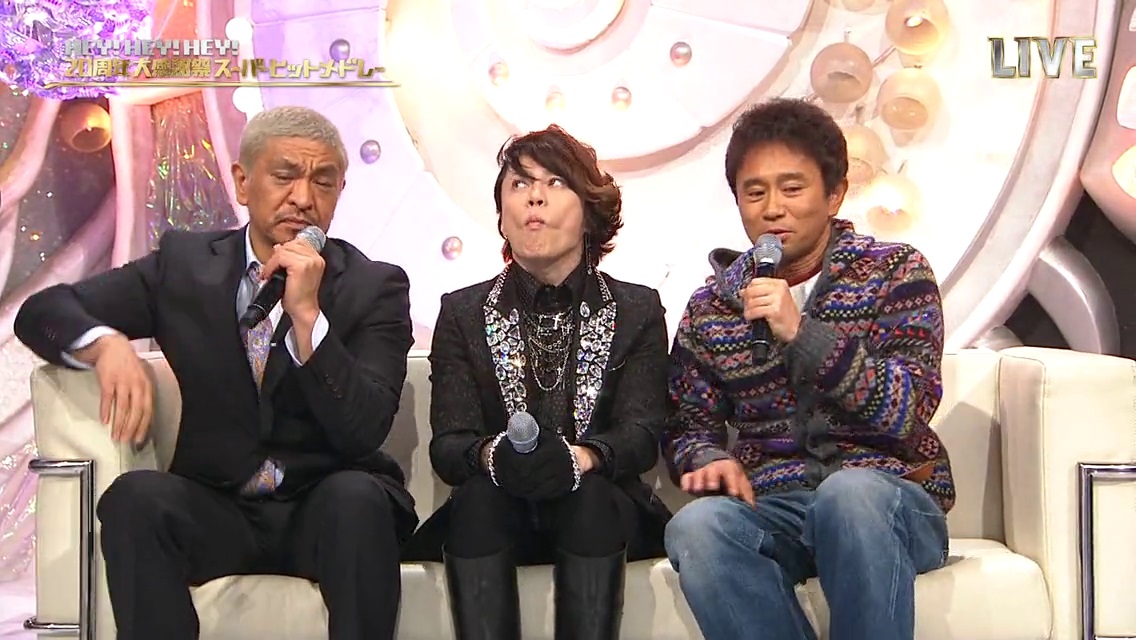 HEY! HEY! HEY! MUSIC CHAMP 20周年大感謝祭 in Japanese. It was too much trouble to translate “Daikanshasai”, which means something like “big thank you party”. Basically a small live concert featuring some big names in the Japanese music industry celebrating 20 years since Hey! Hey! Hey! started… even though it was technically cancelled 2 years ago and had been in decline for a while before that.